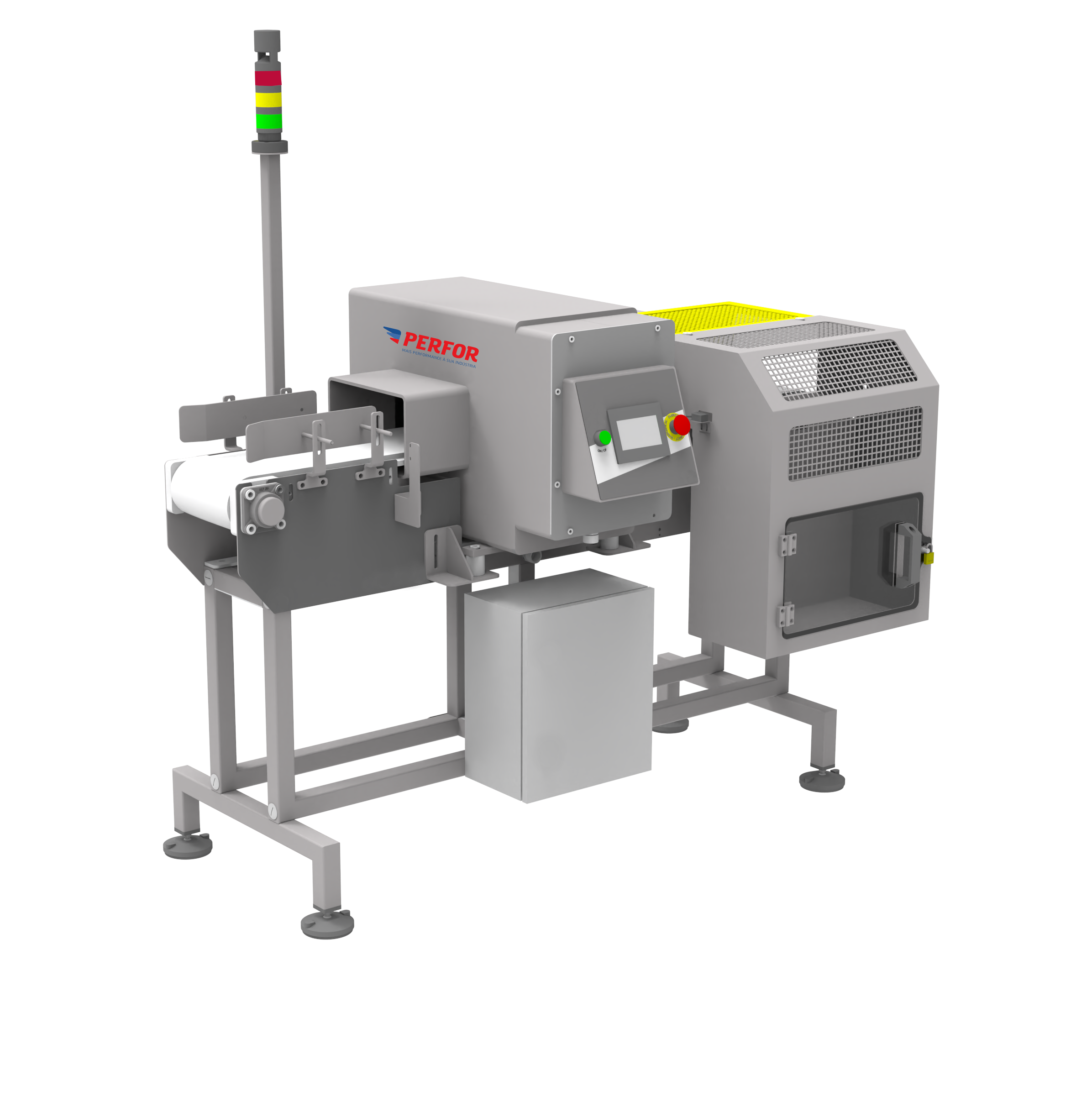 - Os detectores de metais fabricados pela PERFOR baseiam-se, de forma simplificada, em uma antena transmissora, que envia um campo magnético à uma antena receptora. Caso ocorra a passagem de algum contaminante metálico pelo equipamento, o sinal da antena receptora é alterado, possibilitando a detecção do corpo estranho;
